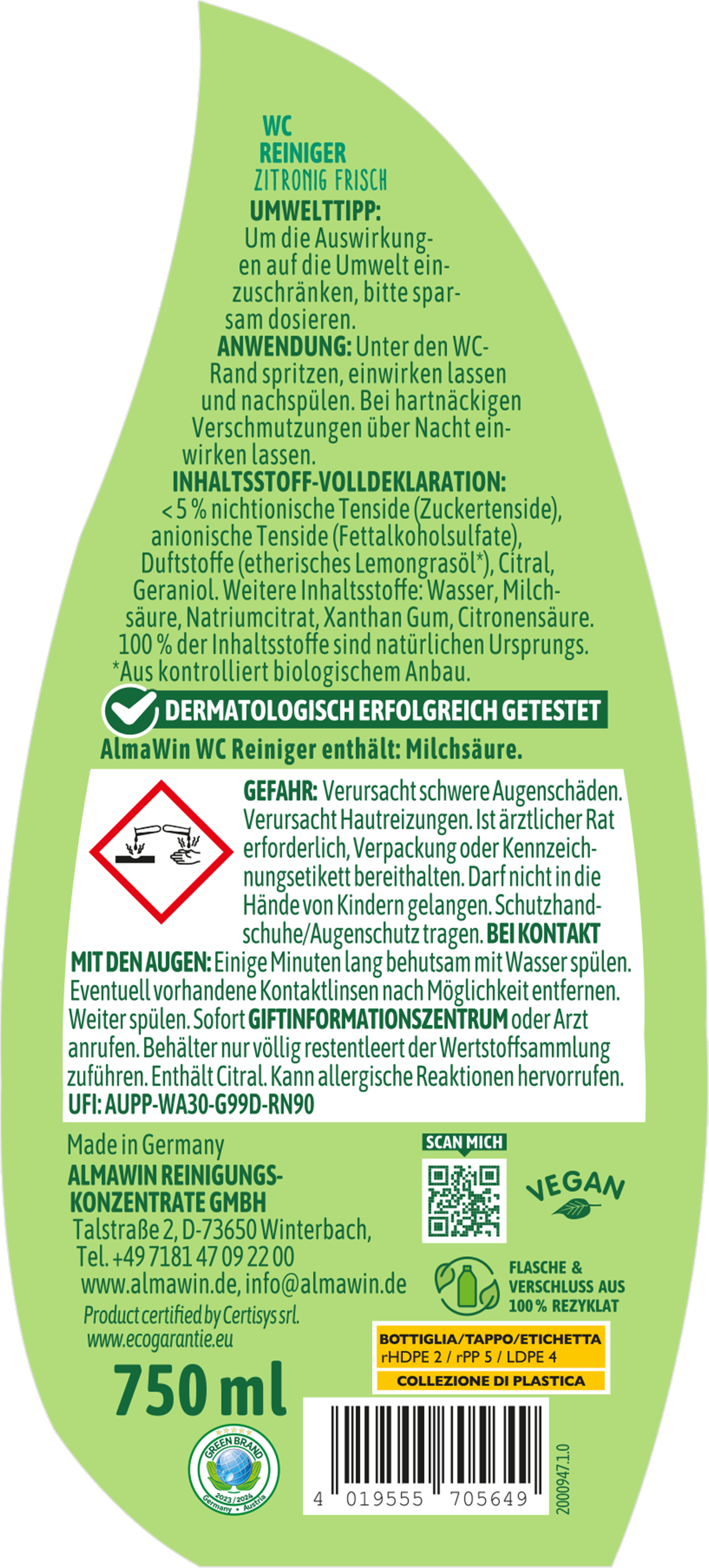 | Hersteller: | AlmaWin Reinigungskonzentrate GmbH, Talstraße 2, 73650, Winterbach, Deutschland, info@almawin.de, www.almawin.de |