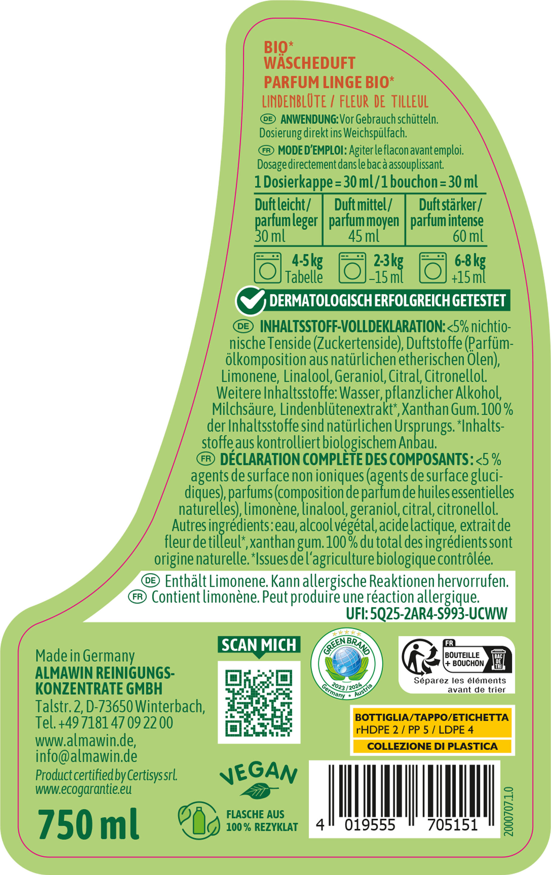 < 5 % nichtionische Tenside, Duftstoffe (Parfümölkomposition aus natürlichen etherischen Ölen), Limonene, Linalool, Geraniol, Citral, Citronellol, Wasser, pflanzlicher Alkohol, Milchsäure, Lindenblütenextrakt[1], Xanthan Gum