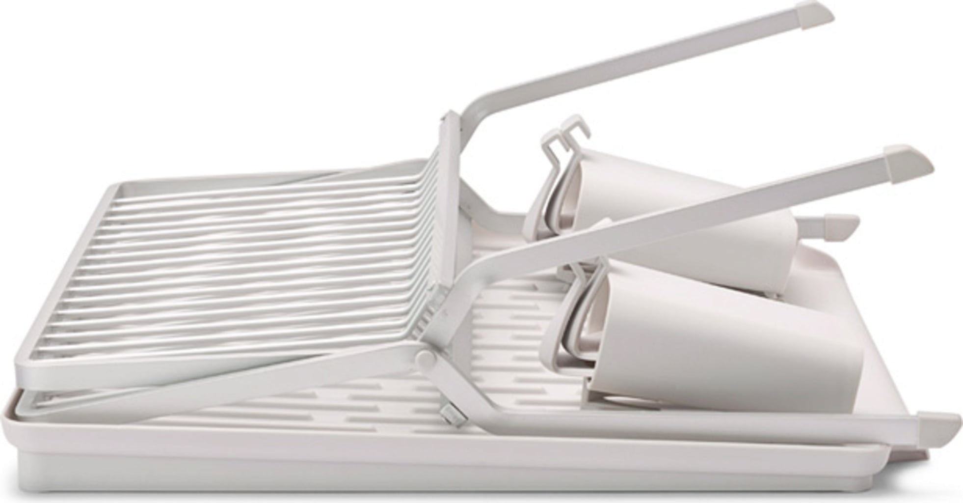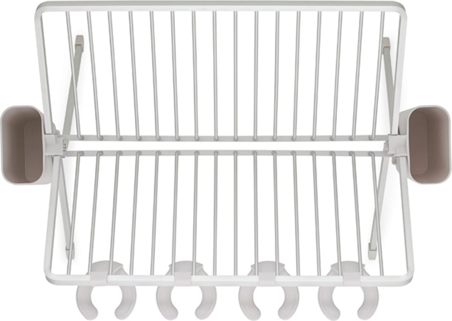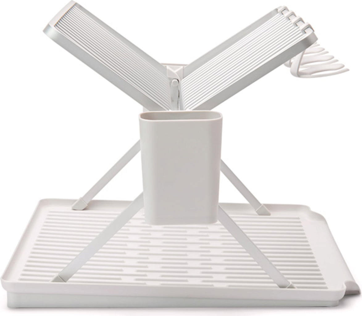 Dieses ebenso praktisch wie optisch ansprechende Abtropfgestell aus Aluminium inkl. gerillter Kunststoffschale und zwei abnehmbaren Besteckkörben ist zum Zusammenklappen fast zu schade. Nichtsdestotrotz lässt es sich im Handumdrehen falten und kompakt verstauen. Es bietet Platz für bis zu 17 Teller und auch Töpfe, Pfannen und Gläser fühlen sich ausgesprochen wohl. Letztere lassen sich an den vier praktischen Haken sicher aufhängen.