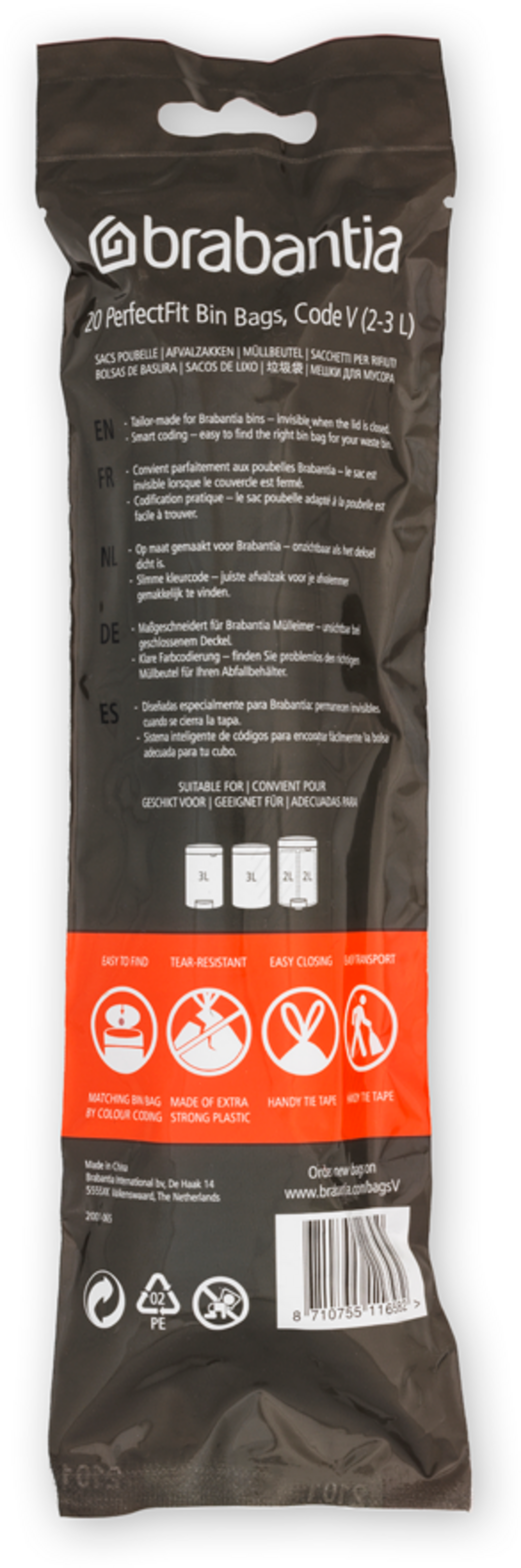 Diese Müllbeutel passen perfekt in die verschiedenen Abfallbehälter von Brabantia und lassen sich passgenau in diese einsetzen. Spezielle Belüftungsöffnungen erleichtern das Einsetzen der Müllbeutel, während das Verschlussband das Herausziehen und Verschließen der Müllbeutel zum Kinderspiel macht.