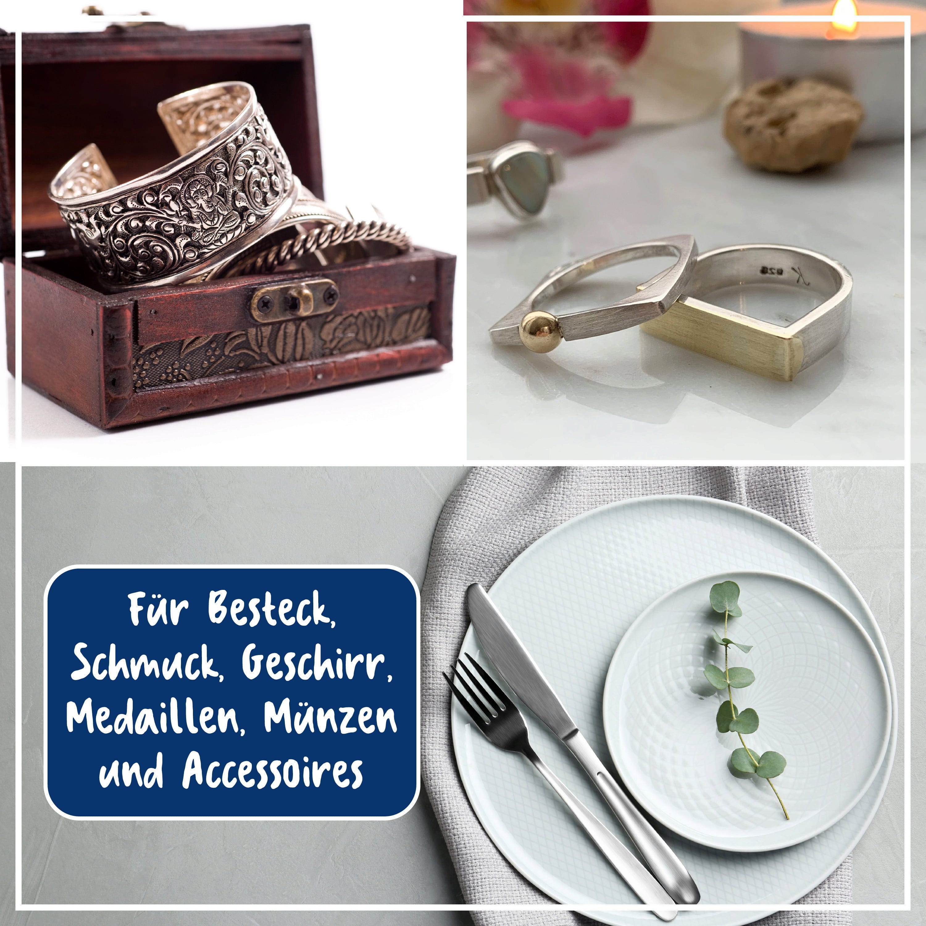 Das Silber Pflegetuch von Poliboy reinigt, pflegt und schützt Gegenstände aus echtem Silber oder Gold und sorgt bei regelmäßiger Nutzung zusätzlich noch für einen dauerhaften Anlaufschutz. Du kannst das Tuch für Schmuck, Kannen, Besteck, Geschirr, Medaillen, Münzen und alle versilberten Accessoires, die du wieder zum Glänzen bringen willst, verwenden.