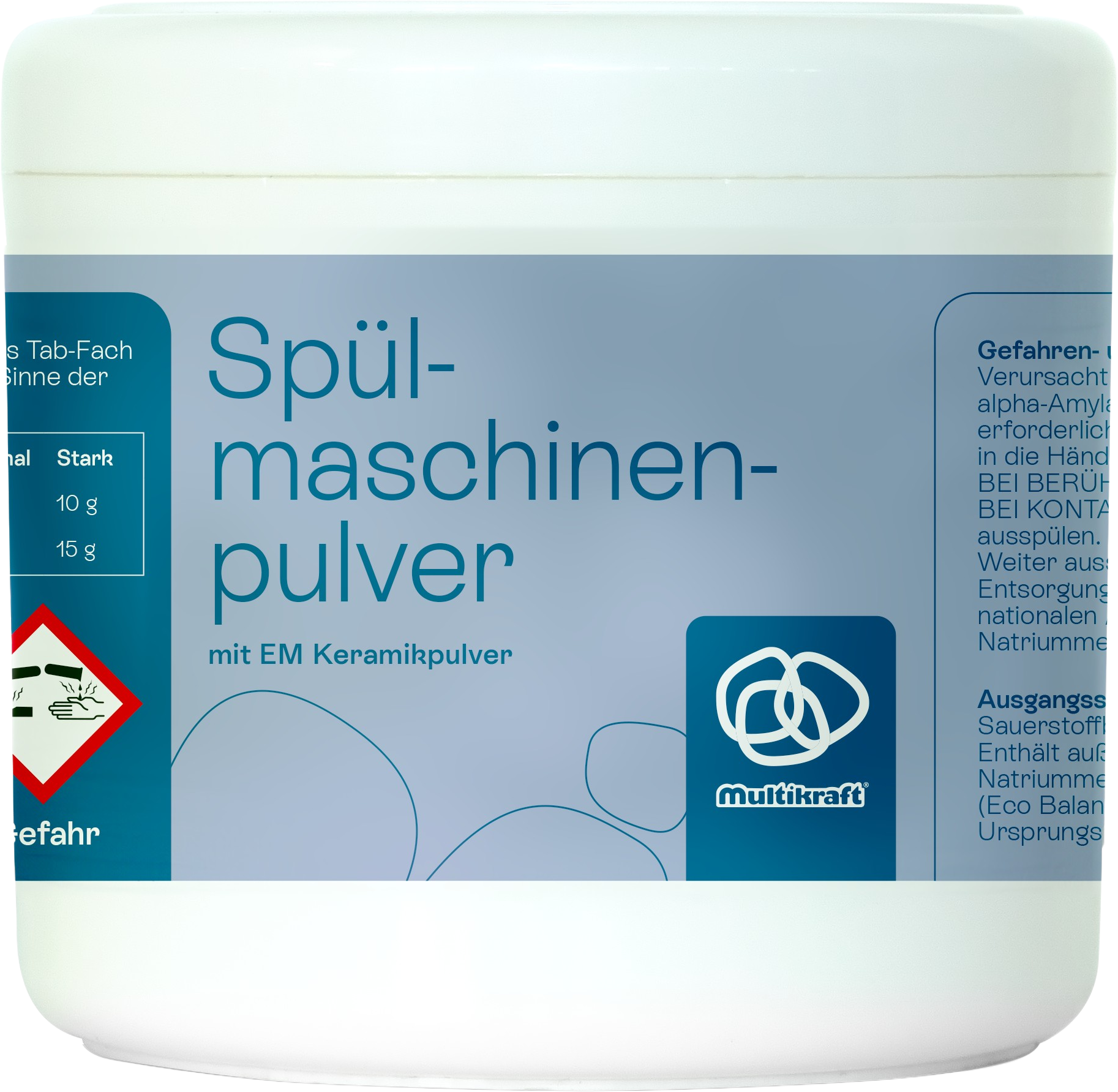 < 15% Oxygen-based bleach, < 5 % Anionic surfactants, Non-ionic surfactants, Enzymes, EM Keramikpulver, Sodium citrates, Sodium carbonate, Natriummetasilikat Pentahydrat, Natriumsulfat-Decahydrat, Trilon M, Tetraacetylethylenediamine