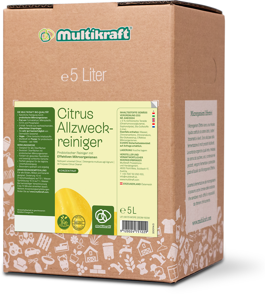 When using the eMC all-purpose cleaner from Multikraft, probiotic microorganisms are used, which break down dirt. The microorganisms also settle on the surfaces and become active again as dirt reappears. The cleaner is suitable for all surfaces, it neutralises unpleasant odours and, with regular use, ensures a healthy indoor climate. The cleaner is very economical and offers you the opportunity to naturally remove dirt and deposits from your home's surfaces.