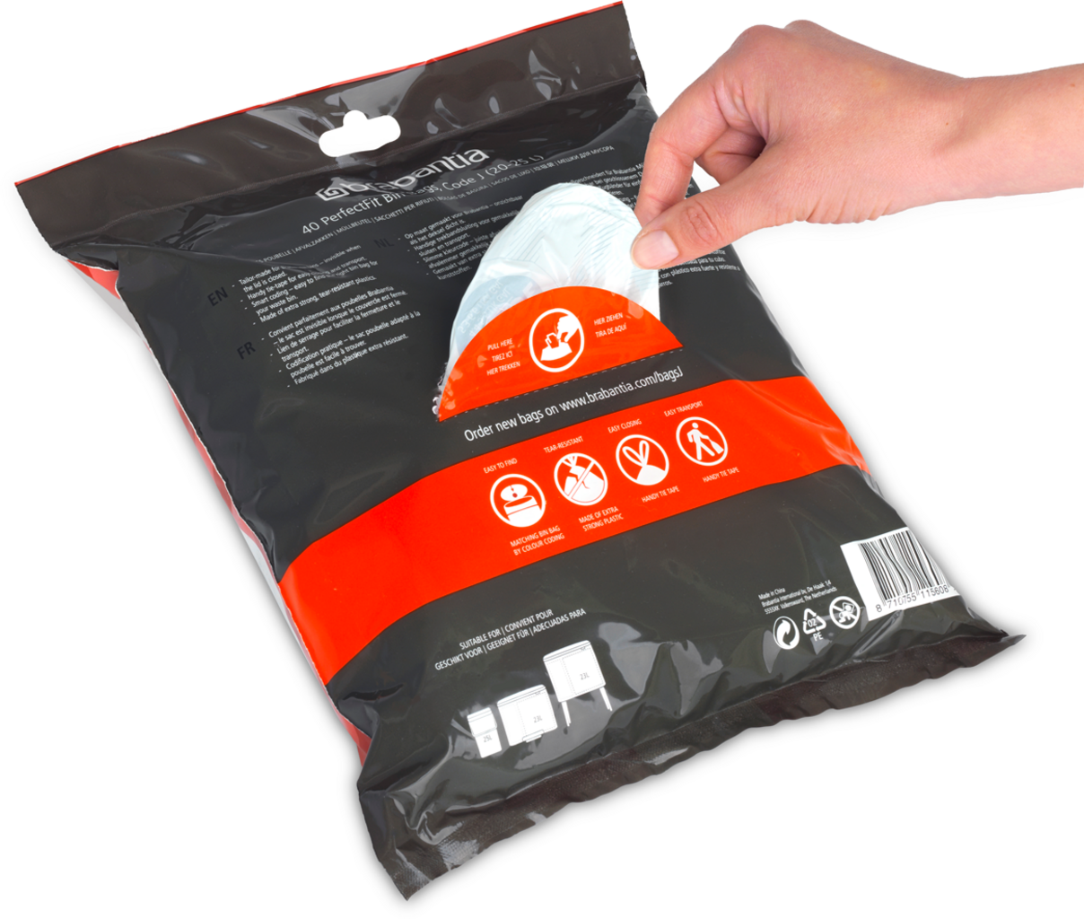 Questi sacchi dell'immondizia in confezione dispenser si adattano perfettamente alle varie pattumiere Brabantia, in cui possono essere inseriti in modo perfetto. Speciali aperture di ventilazione facilitano l'inserimento dei sacchi della spazzatura, mentre il nastro sigillante ne facilita l'estrazione e la chiusura.