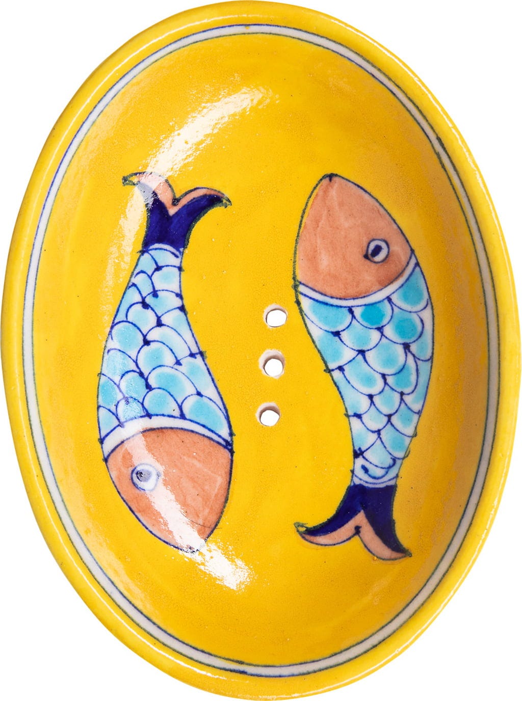 Acquistando questo portasapone, non solo scegli un elegante e colorato accessorio per il bagno, ma supporti anche l'arte tradizionale della ceramica di Jaipur. Proveniente da una regione dove la produzione di Blue Pottery è una tradizione radicata, questo postasapone ha una forma ovale e pratici fori per il drenaggio dell'acqua, permettendo al sapone di asciugarsi correttamente dopo l'uso.